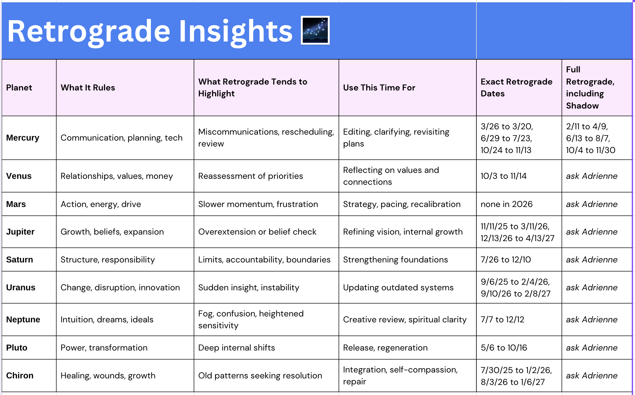 2026 Retrogrades, At a Glance Feb 8 Written By Adrienne Dalaly Adrienne Dalaly http://www.adriennedalalyconsulting.com